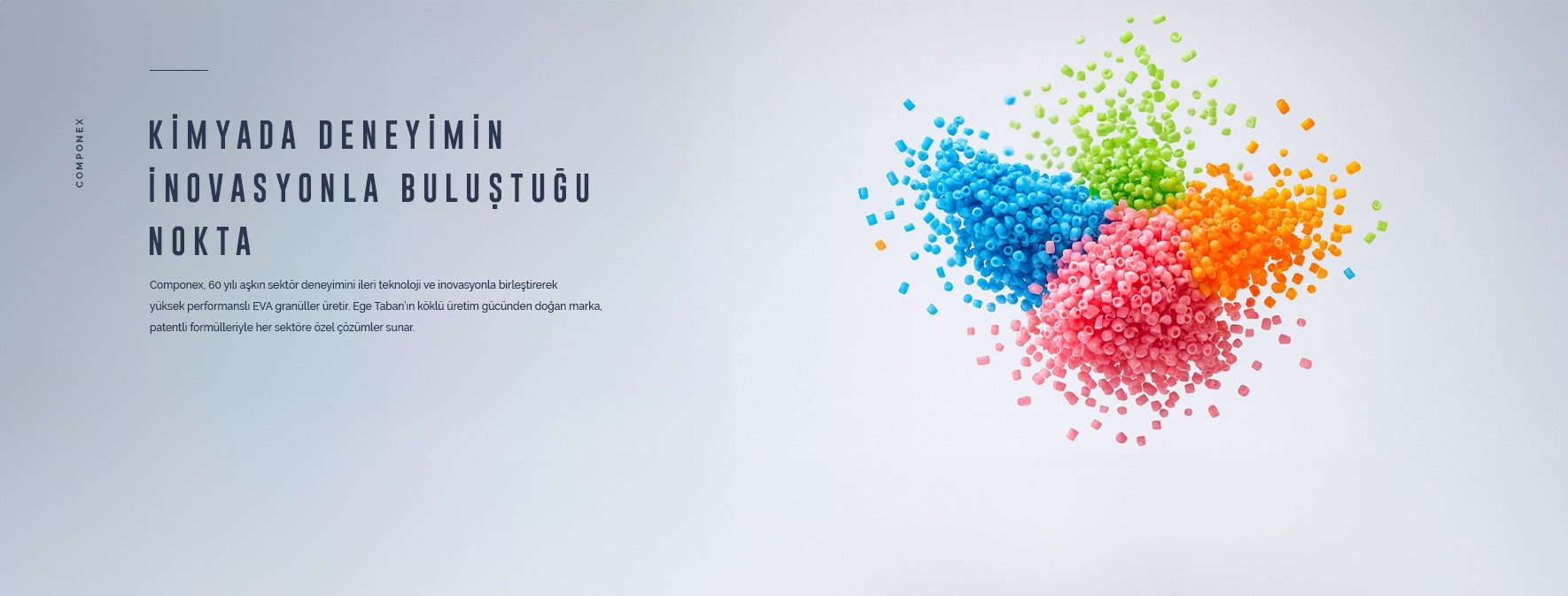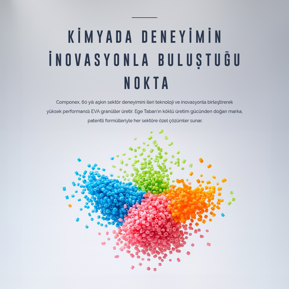 EVA Sulu Kesim (günlük ~6 TON) ve EVA Kuru Kesim (günlük ~3 TON) granül makineleri ve kapasiteleri ile birlikte günlük olarak 9 TON granül üretimi yapılmaktadır. Componex, farklı sektörlerin ihtiyaçlarına göre her bir sektöre ve müşteriye özel hazırlanmış formüller ile üretilen granülleri ile hizmet vermektedir.